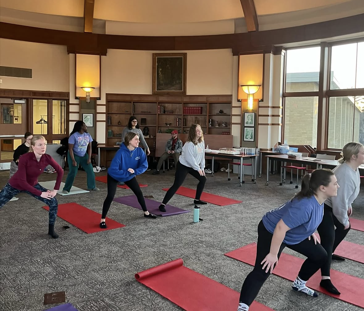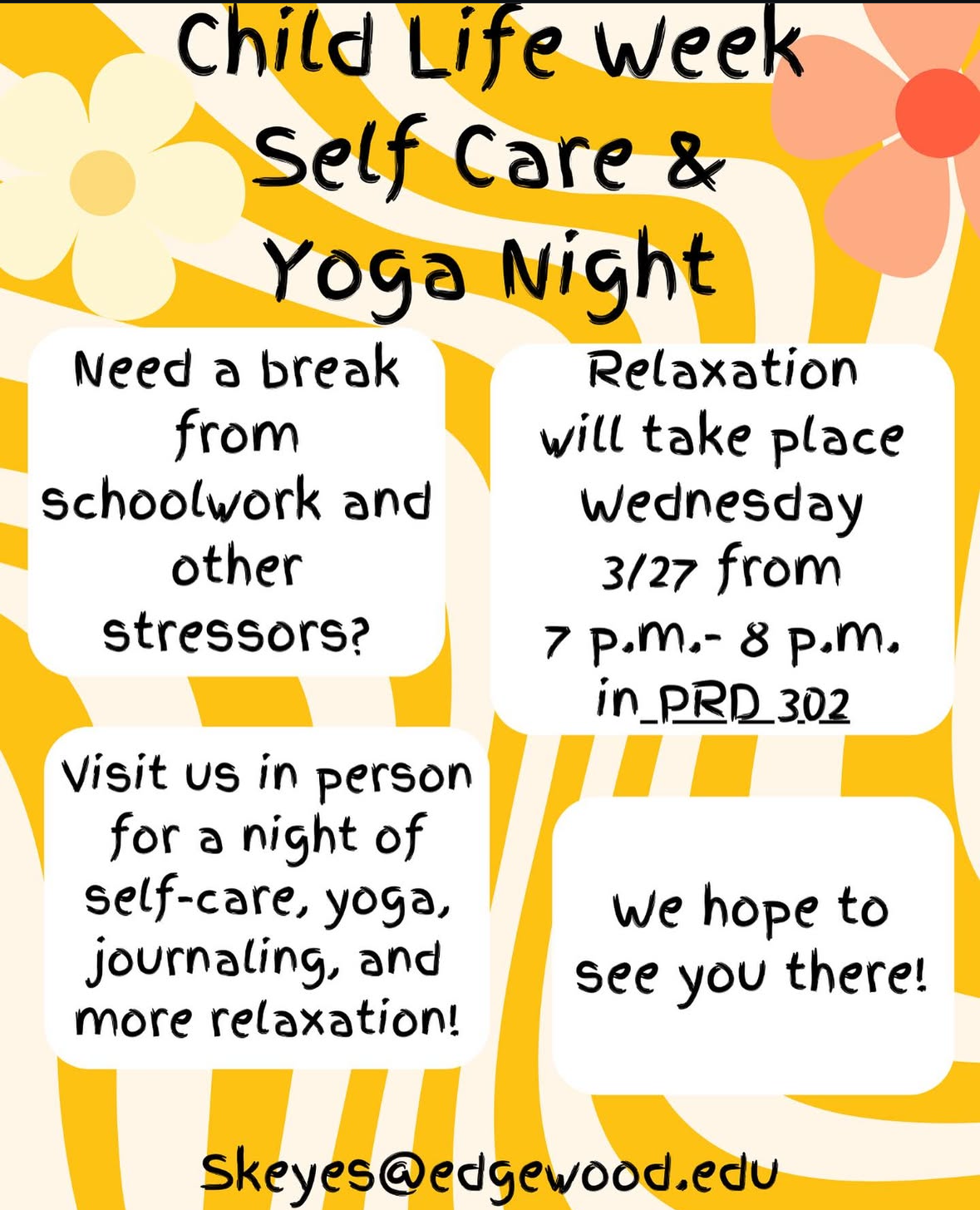 As part of our Child Life Week programming at Edgewood College, we hosted a self-care evening open to all students, both within and outside of the Child Life program. In coordination with campus facilities and a certified yoga instructor, we organized a guided yoga session focused on relaxation and mindfulness. Following the session, we facilitated a creative journaling activity where participants decorated their own journals as a tool for reflection and self-expression. The event promoted the importance of self-care and emotional wellness among future helping professionals and the broader student community.