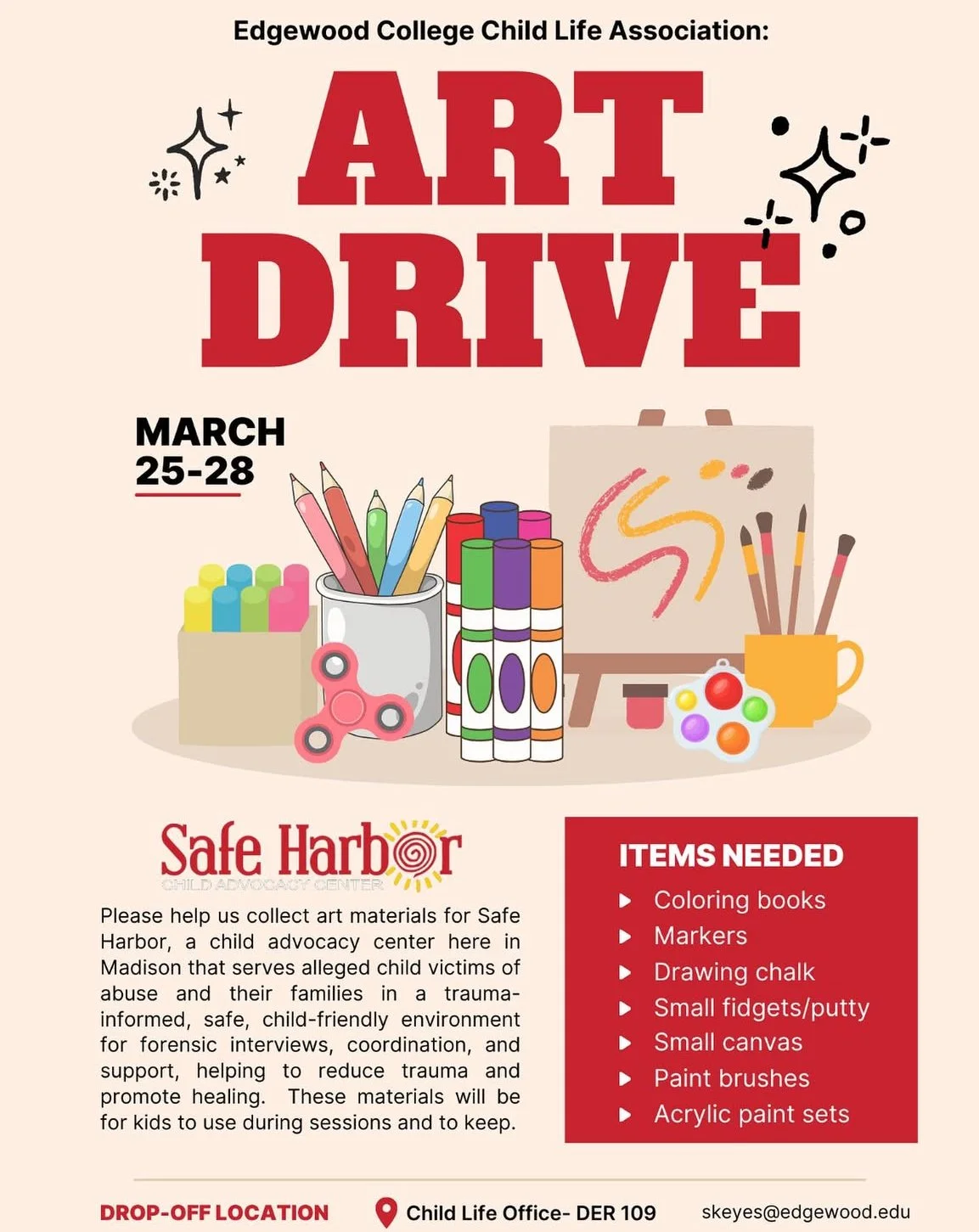 As part of Child Life Week, we organized an art supply drive to support Safe Harbor, a local child advocacy center. In preparation for the event, we collaborated directly with Safe Harbor staff to identify their specific needs and determine the most effective ways to provide support. The drive aimed to collect developmentally appropriate art materials to enhance the center’s ability to offer creative and therapeutic outlets for the children they serve.