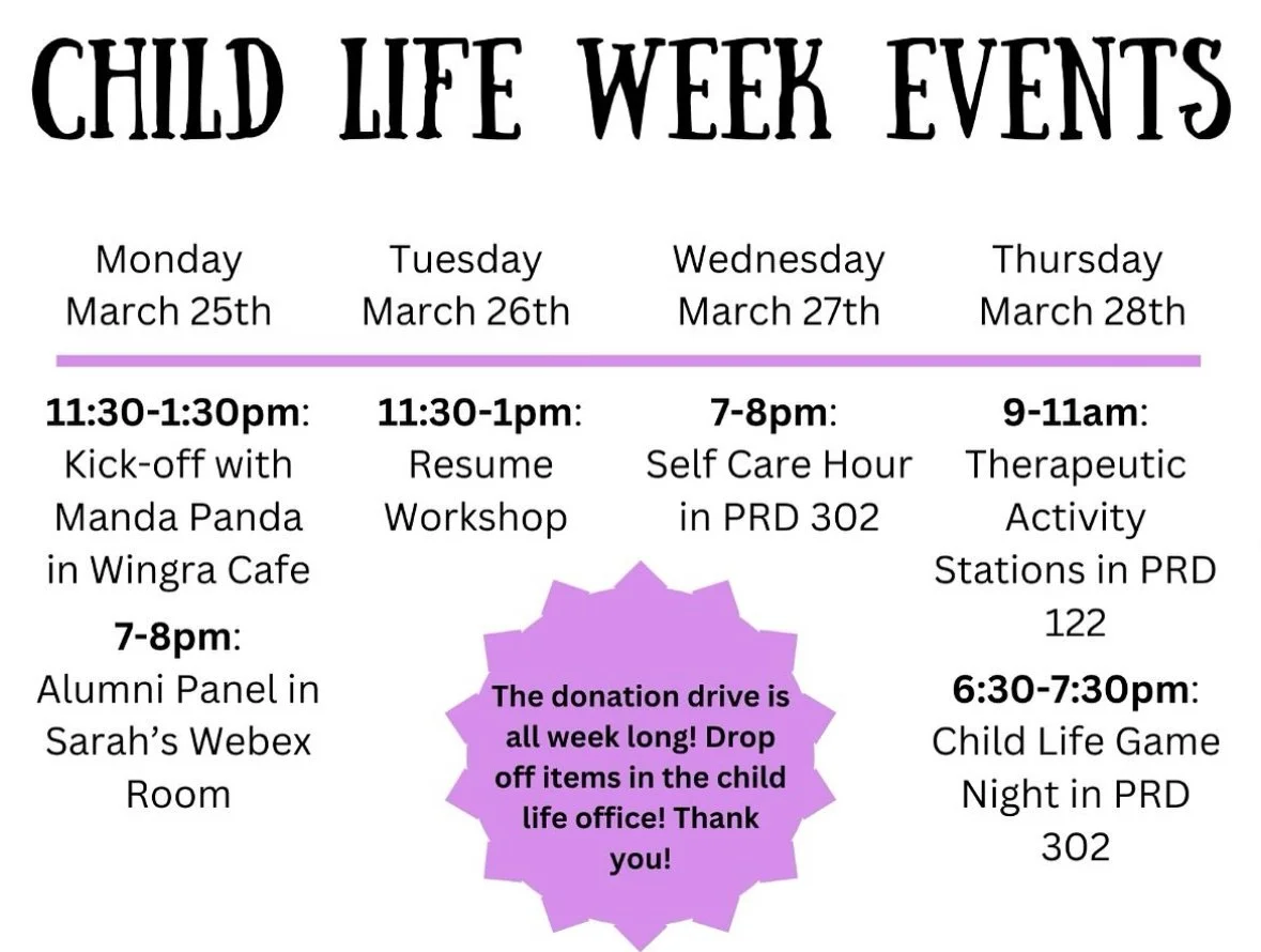 As part of the “Materials and Methods of Play” course at Edgewood College, my cohort and I collaboratively organized a week-long series of events in recognition of Child Life Week. The initiative aimed to raise awareness and educate the campus community—including students, faculty, and staff—about the Child Life profession, its core principles, and the therapeutic value of play in pediatric healthcare settings.